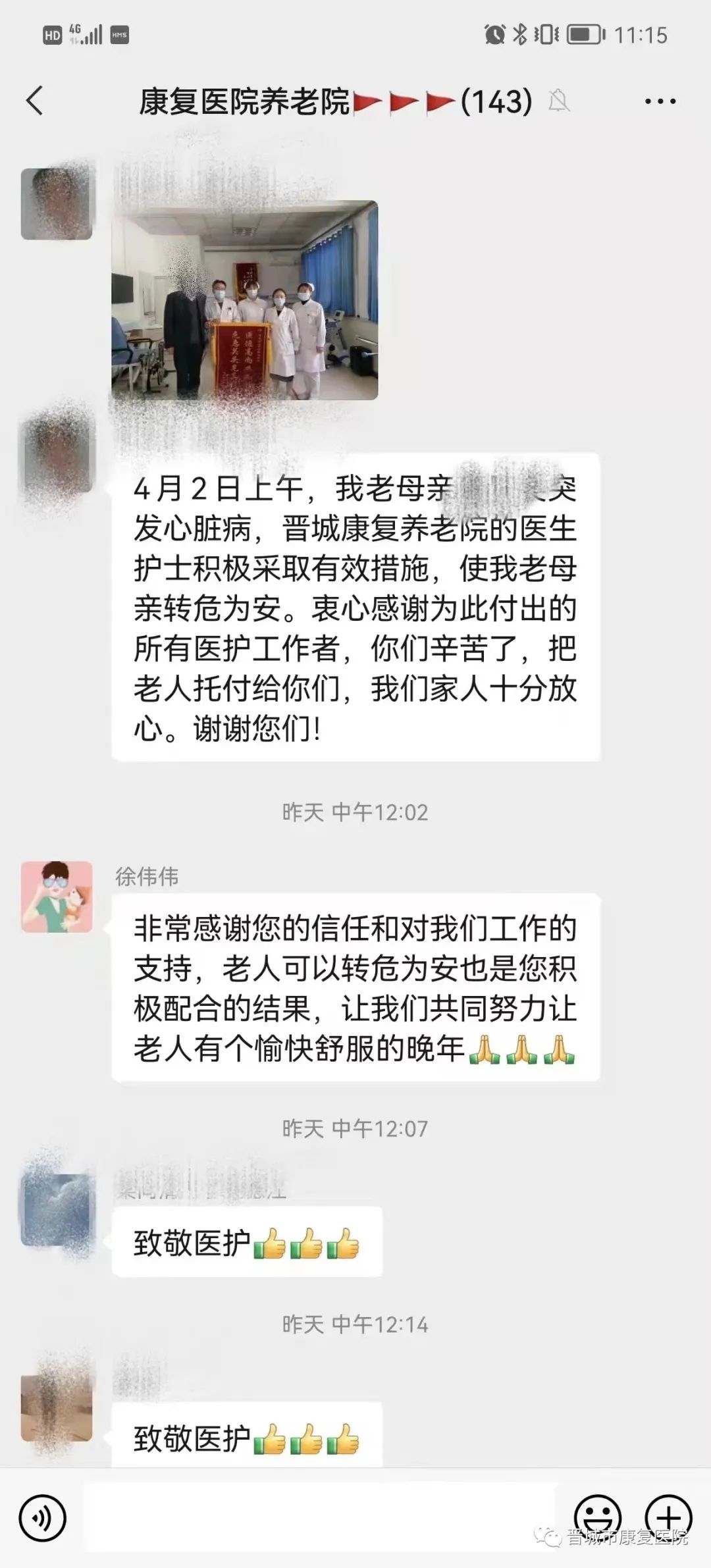 事后第3天,藏奶奶家属为感谢老年康复科医护人员危急关头对藏奶奶的及时救护和平时无微不至的关心照顾,特送来写有“医德高尚业务精,危急关头见真情”字样的锦旗。