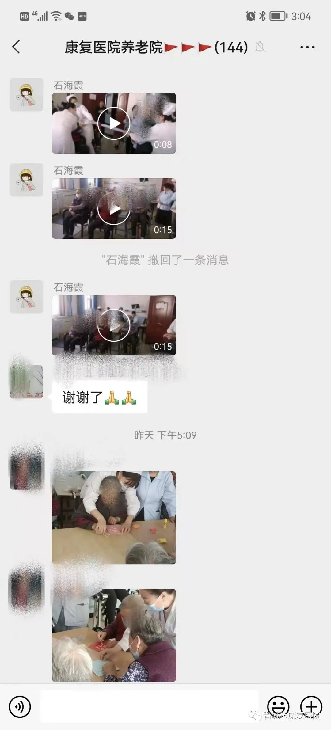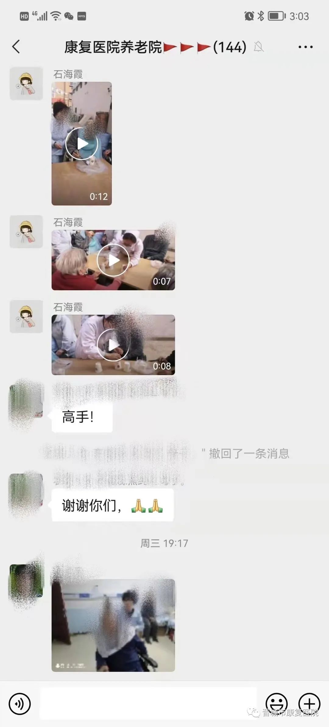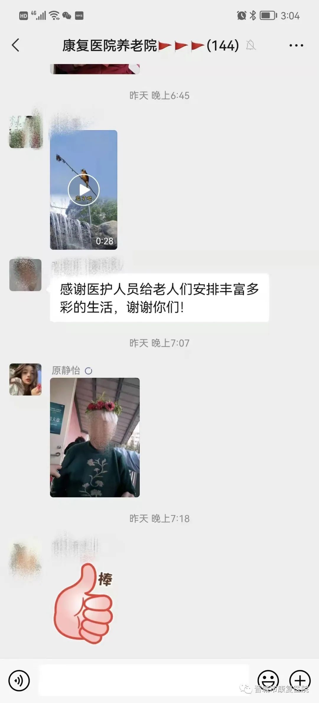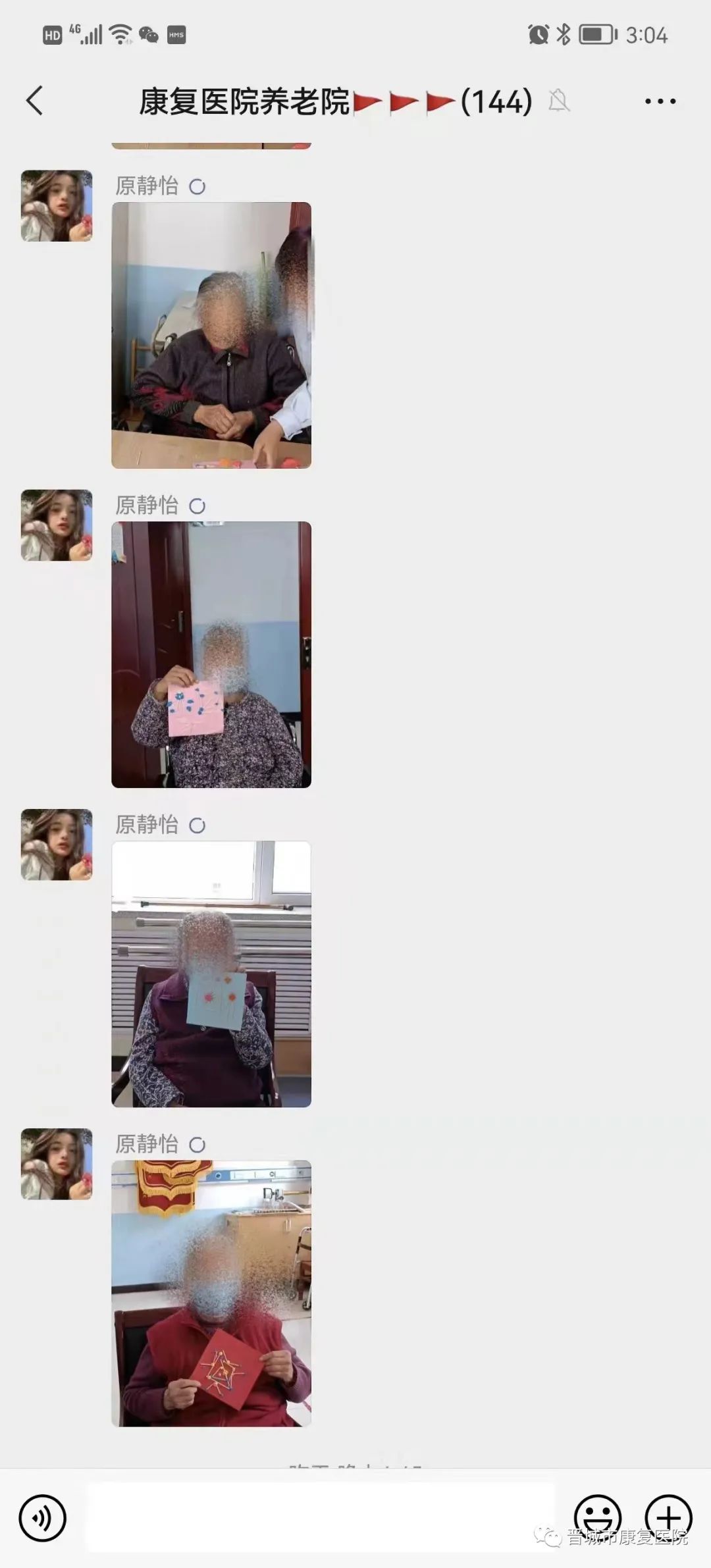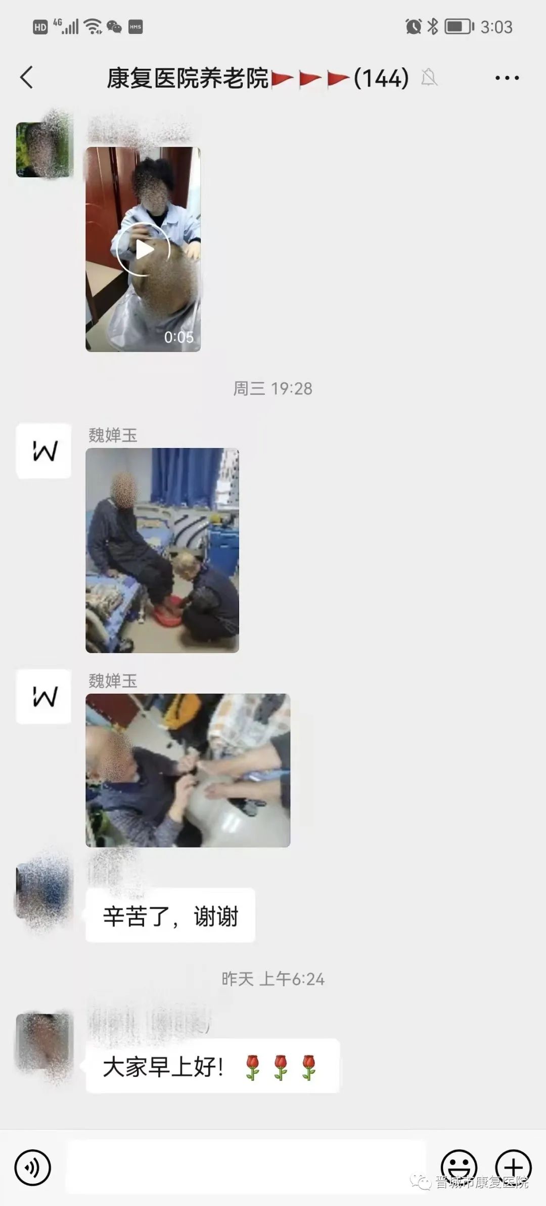 古语说“老吾老以及人之老”,对老人健康无微不至的关注与照顾,只是老年康复科日常工作中的一个缩影。在平时,为了让爷爷奶奶们不感到孤独烦闷,医护人员每天都会陪着老人活动锻炼、拉家常,给老人洗头、剪发,安排丰富多彩的活动,一起游戏、一起做手工、一起拍视频,欢声笑语不断。同时,为了缓解家属疫情期间无法见到老人的烦恼,医护人员每天都会将老人的点点滴滴以照片、视频的方式发在医患交流群里,使家属随时能看到老人的状态,这一做法得到了家属的肯定和赞誉。