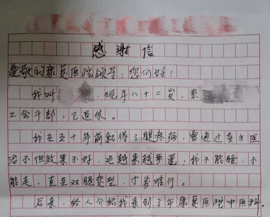 后来,经人介绍我来到了市康复医院中医科,科主任张敏继和科里的大夫们给我针灸,吃药,拔罐,贴膏药,理疗,通过一系列的多次精心治疗,我的腿逐步恢复了健康。现在我可以走上几里路也不觉得腰酸腿疼。我走起路背正、腿直没人能看得出我已是八十二岁的高龄老人了。