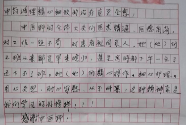 中医科的全体大夫们医术精湛,医德高尚,对工作一丝不苟,对患者视同亲人,她(他)们上班从来都是早来晚归,甚至有时候下午一点了还下不了班。她(他)们精心操作,细心护理,用心关照,耐心安慰,从不叫累!这种精神真是我们学习的好榜样!!!
