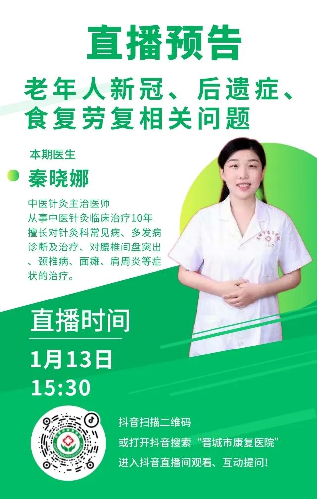 老年人感染新冠病毒后有哪些症状特点?产生什么后遗症?如何进行治疗和康复?愈后有哪些注意事项避免复发?明天(1月13日)下午3:30,晋城市康复医院中医针灸科主治医师秦晓娜,为广大市民朋友开设老年人新冠防治健康大讲堂直播活动!直播授课结束有答疑互动环节,欢迎大家进入直播间!