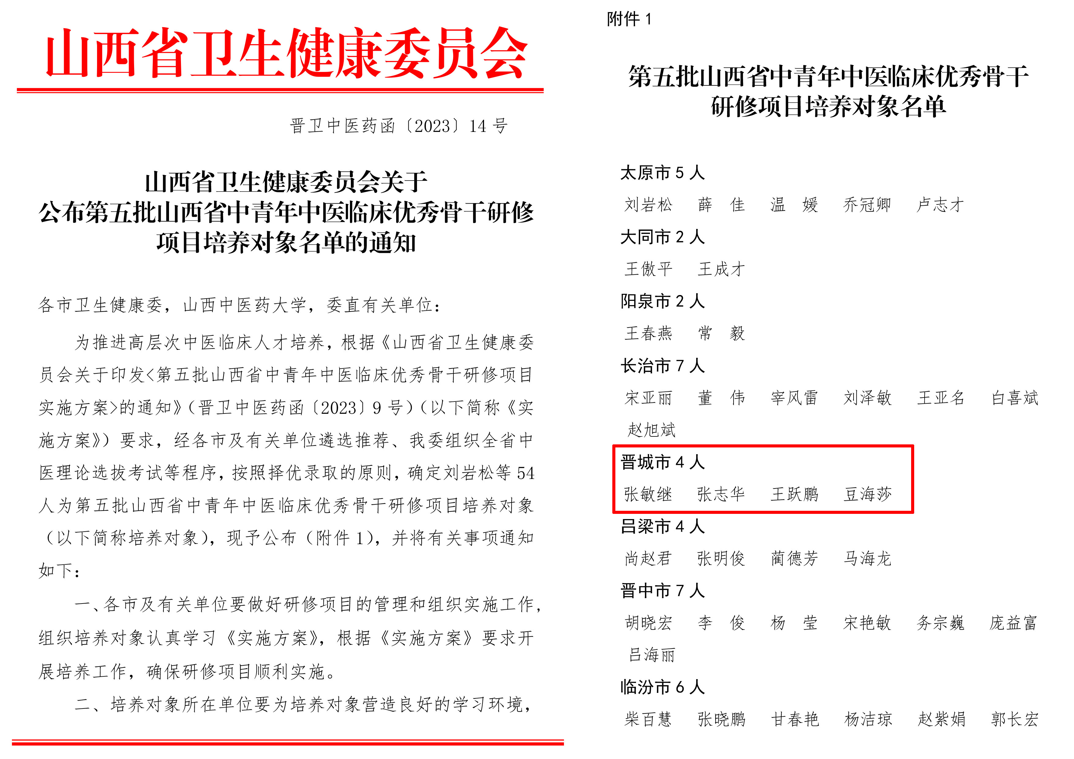 近日,山西省卫生健康委员会发布通知,公布《第五批山西省中青年中医临床优秀骨干研修项目培养对象》入选名单,确定54人入选,其中晋城市入选4人,我院中医科副主任医师张敏继名列其中,这是对培养对象扎实的中医药理论基础和较丰富临床经验的认可,对推动我院中医内涵发展、提升中医服务能力具有积极意义,标志着我院中医药人才培养有了新的突破。