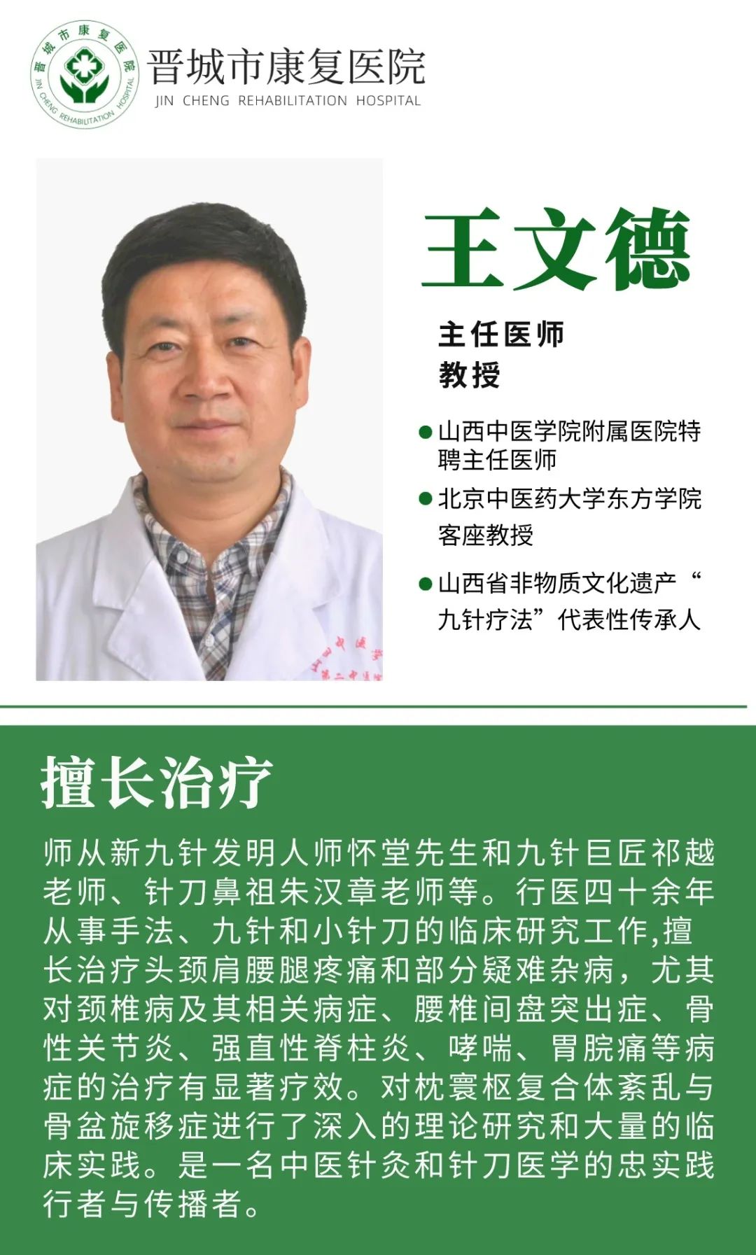 为满足广大患者的就医需求晋城市康复医院特邀山西中医学院附属医院特聘主任医师、北京中医药大学东方学院客座教授、山西省非物质文化遗产、“九针疗法”代表性传承人