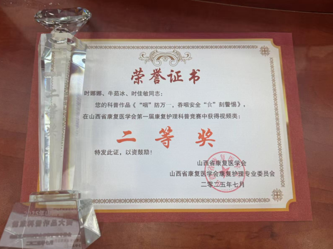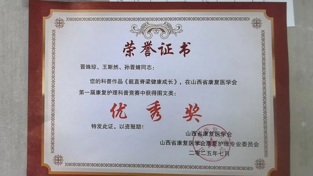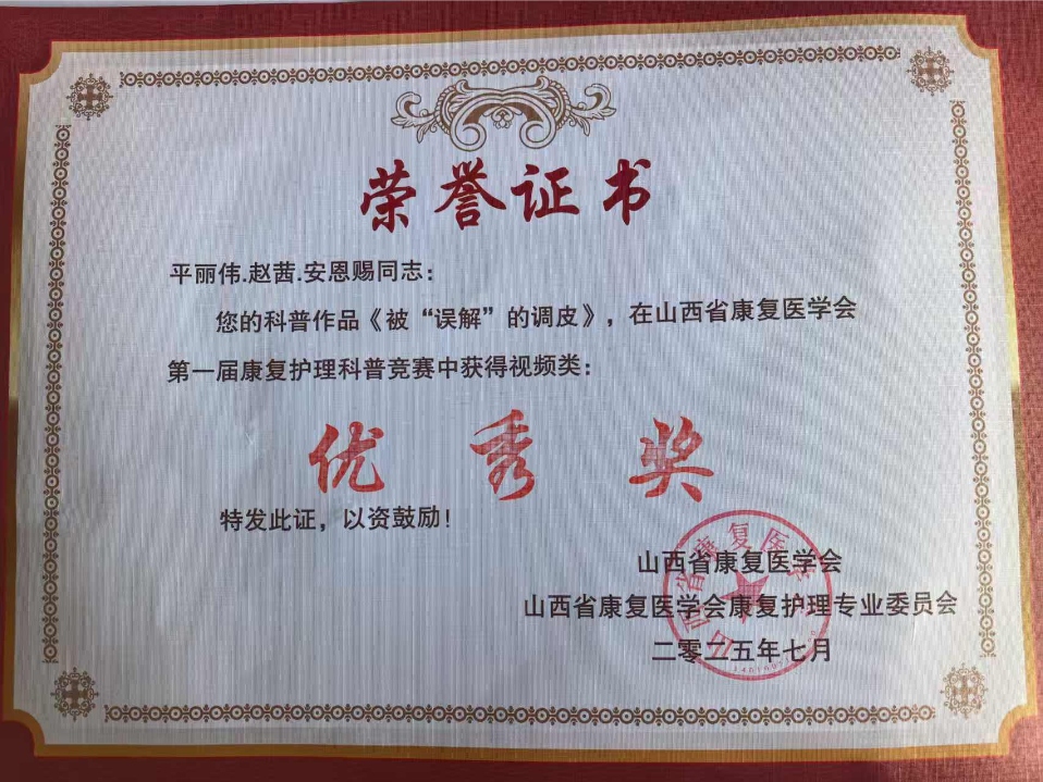 2025年7月3日至6日,山西省康复医学会康复护理专委会学术年会暨康复护理科普竞赛圆满落幕。 晋城市康复医院参赛团队凭借扎实的专业素养和创新的科普作品,在200余件参赛作品中脱颖而出,斩获视频类二等奖1项、优秀奖1项,图文类优秀奖1项,充分彰显了医院在康复护理领域的综合实力。