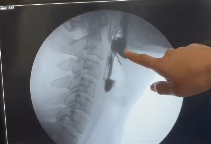 患者因延髓梗死入院,入院时存在严重吞咽障碍,无法经口进食,需依赖鼻饲管维持营养。入院后行吞咽造影检查(VFSS),结果显示: